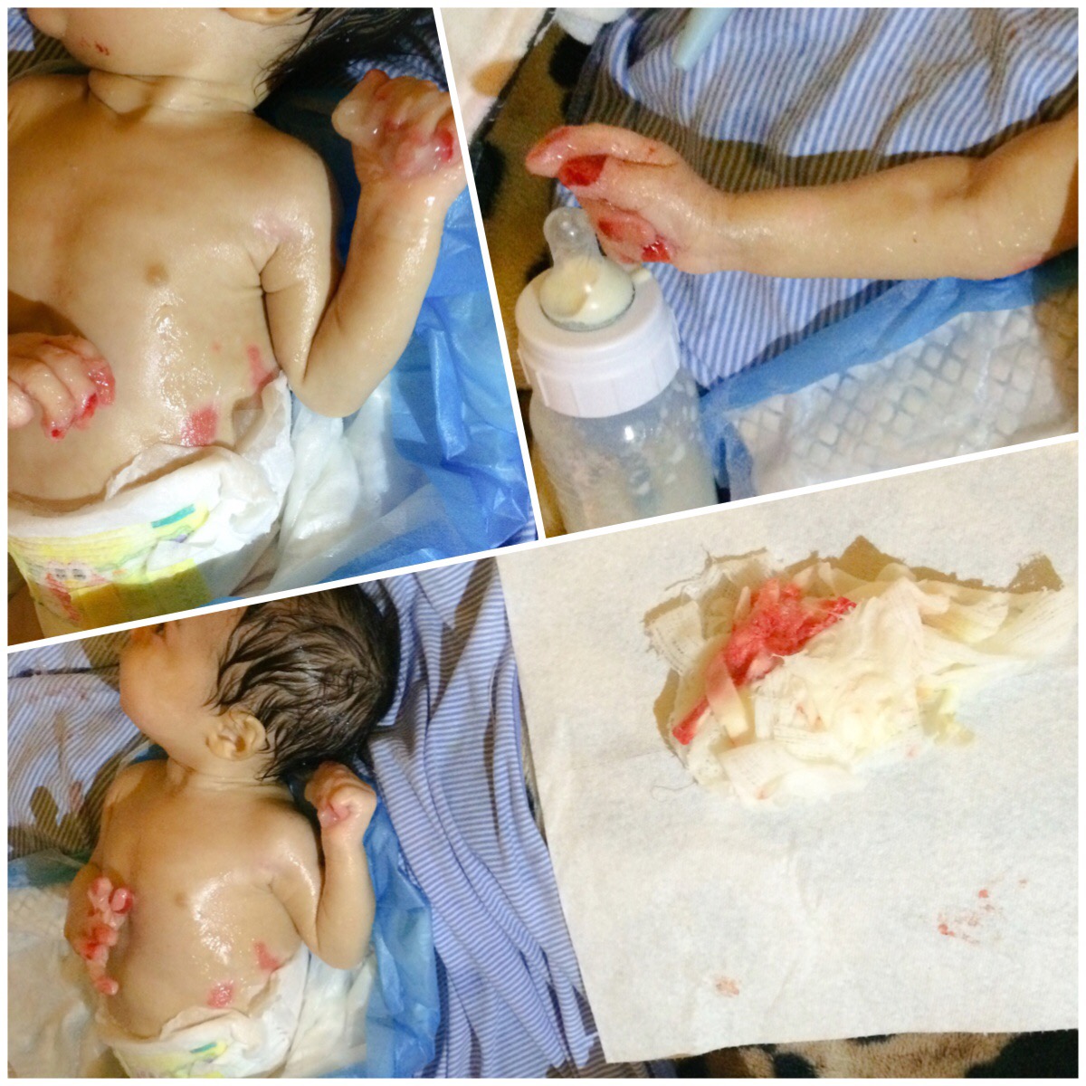 Ethan is 2 months today ☺. We are very thankful that the skin that was ripped off of his face-cheeks and shoulder by the tape holding the oxygen and feeding tubes in place when he was intubated on November 27th is continuing to heal and have been reduced to only discoloration. Any sorrow we felt was quickly replaced by a feeling of determination to keep him both alive and as comfortable as possible. The extensiveness of Ethan’s daily care is so time consuming that it is unattainable without daily assistance from at least one well trained family member or family friend. In the days that Ethan stayed at Stanford’s Lucile Packard Children’s hospital (December 2nd through 12th), Ethan always had at least one nurse dedicated to his care for all 24 hours of the day. Even with the care of a busy nurse, to insure proper care my husband had to assist towards Ethan’s care at the hospital from 8:30 am to 10:30 pm only resting for a quick lunch and sometimes dinner. Even with all the great experienced specialist and nurses that have worked with EB patients in the past assisting us, Ethan’s malnutrition was causing significant weight loss and his heavy breathing during feeds was always prominent. We were presented with the options of placing a feeding tube in through his nose or a g-tube that would be inserted through his abdomen directly into his stomach. Fearing that a tube would cause more legions to form internally and knowing his inability to heal in certain places we chose to bring Ethan home to spend more time assisting him with his feeds. When we got home we kept two things in mind, although we took great care of him at the hospital, Ethan would not survive without a higher, more time consuming level of care and each day is different then the last, the best way to take care of him today might be different than yesterday, all depending on our resources and on his feelings. For example, he used to ingest more formula when he was in a sitting position with his head cocked back, eyes almost parallel to the ceiling because of his heavy breathing problems, but for the past few days, laying slightly propped up on his side seems to be more comfortable for him. We are restless and diligent in caring for Ethan in order to increase his probability of life. Apart from the prayers of our community, spending time in determining the most effective way of caring for Ethan by paying great attention to every aspect of his care is pivotal for Ethan’s survival. Every person with EB is different and the amount of care required for their condition also is different. For this reason we take all the recommendation that are provided for EB Patient care and slowly find out which ones may work for Ethan and which can be modified to also fit the care that Ethan needs.