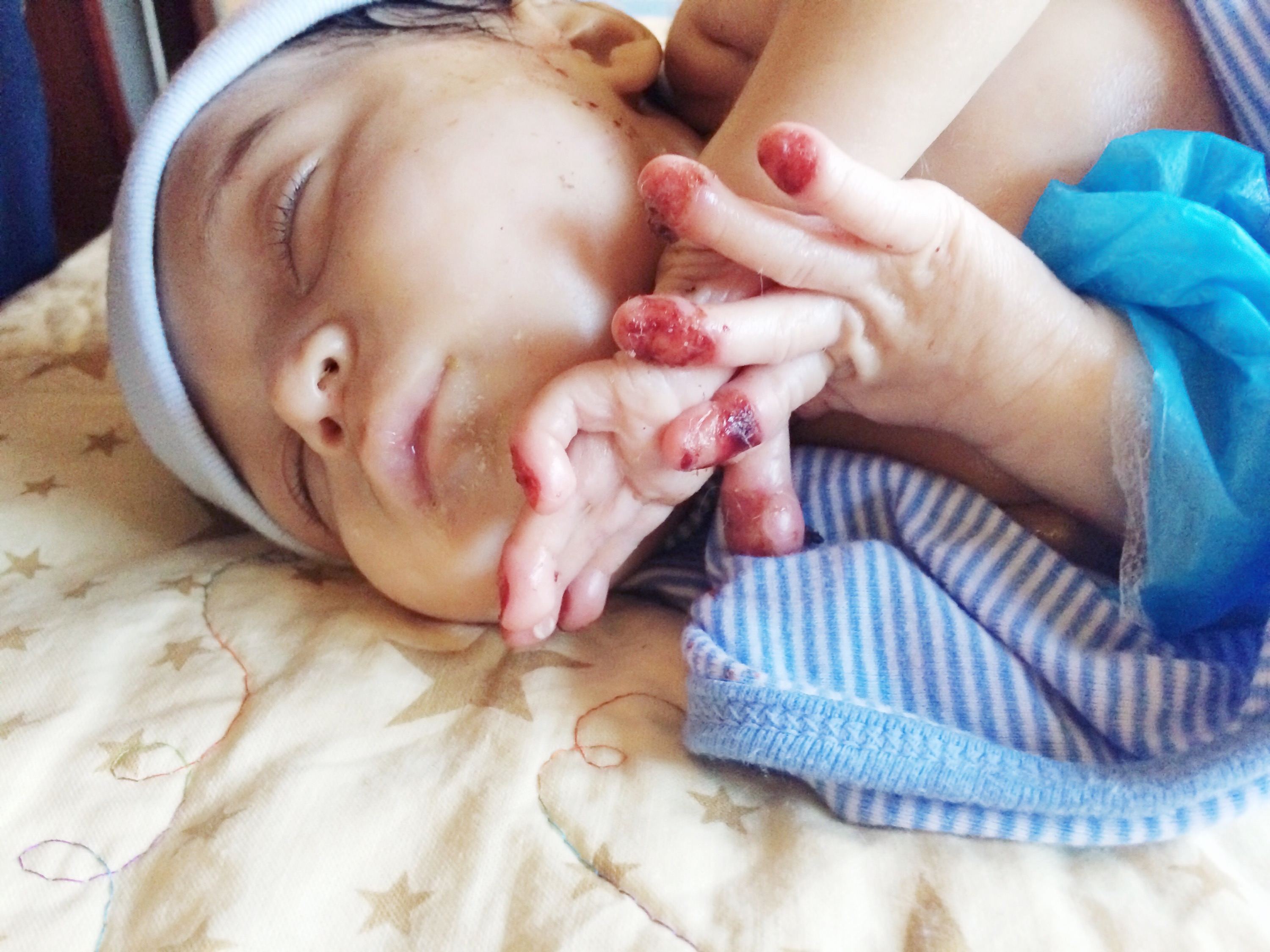 There are a few important thing for us to take into account in Ethan’s daily care, any small amount of friction on his skin will cause the poorly joint skin to split resulting in a blister, any blister that do form need to be popped immediately to prevent spreading. Any adhesives stuck to the skin will result in the tearing of skin off the tissue, neglecting the spread of bacteria will cause infection, malnutrition leads to slow development and a weakened immune system. Ethan only ever briefly wears clothes for special occasions. Just long enough to snap a photo in our effort to create some type of memories. Even then, he has four layers of gauzes on his skin that range inside to out from lathered in a thick layer of Aquaphor (the main healing ointment for his skin) to a relatively dry exterior. The layer that makes contact with the raw skin is an Aquaphor coated strip of either Mepitel or Mepilex. Gauzes of this material are priced at about $7.70 for one sheet of 3×4 inches. but are essential in ensuring that the skin will not be ripped off the tissue when removing a gauze that has dried out of Aquaphor. The second layer is a heavily coated strip of Vaseline Gauze. The third layer is a moderately coated layer of cotton cause. The fourth layer is a Aquaphor insulated tubular netting gauze that holds the structure of the other gauzes into place. We invest a significant amount of time on wrapping his hands to strive to keep their full dexterity. Roughly two hours of preparation and one hour administering the gauzes. Strips of vaseline gauze are placed in between each finger to prevent any joining of he fingers. Each finger is then wrapped individually with all 3 layers of gauzes and lightly pulled toward the back of the hand the secured with the gauze in an upright extended position to retain full mobility in the fingers. Ethan is kept on specially prepared diapers that have all elastic removed and are layered with a thick coat of Aquaphor. Ethan is then placed on a specially prepared 23×23 in. blue medical chuck moderately layered with Aquaphor. Ethan’s exposed skin is covered in Aquaphor, more so in raw areas. Finally, Ethan is swaddled in a 100% cotton baby blanket. To prevent the spread of bacteria, we remain in our home as much as possible with an extremely limited number of visitors. Sterile needles are used to pop blisters. All surfaces are constantly disinfected. Scissors and other supplies are constantly disinfected. Gloves are used and disposed of after removing the gauze off of each extremity. Gloves are used and disposed of after every diaper change. Cetaphil cleanser is used in every diaper change. If a gauze is tainted by a small amount bodily fluids or stool than it is replaced. New gloves are always used when placing Aquaphor directly on his skin. Ethan uses a Dr. Brown Bottle with a special blue valve that allows formula to come out with just a light touch of the nipple. Even his bottle’s nipple need to be lightly coated with Aquaphor. At day’s end Ethan will have utilized three and a half 14g Aquaphor tubs ($56), two 3×4 Mepitel sheets ($15.40), 10 medical blue chucks ($1.50), vaseline, cotton and tubular netting gauzes ($5.00 after insurance coverage). His medical supplies are roughly $77.90 a day and over 2,300 in a month. Our finantial inability to buy Aquaphor online in bulk has lead us to clean out every Target and Walmart of 14g tubs of Aquaphor in the city of Stockton Ca. Last night I had to empty out the Target in Lodi Ca. We are desperate to raise the funds to buy a decent amount of medical supplies before our savings are exhausted to their entirety. If you are interested in watching our strategies in maintaining Ethan’s skin I would like to inform you that I will be posting videos on how we bandage his hands and legs on Saturday. I will also be posting videos on how we prepare his diapers and medical blue chucks.