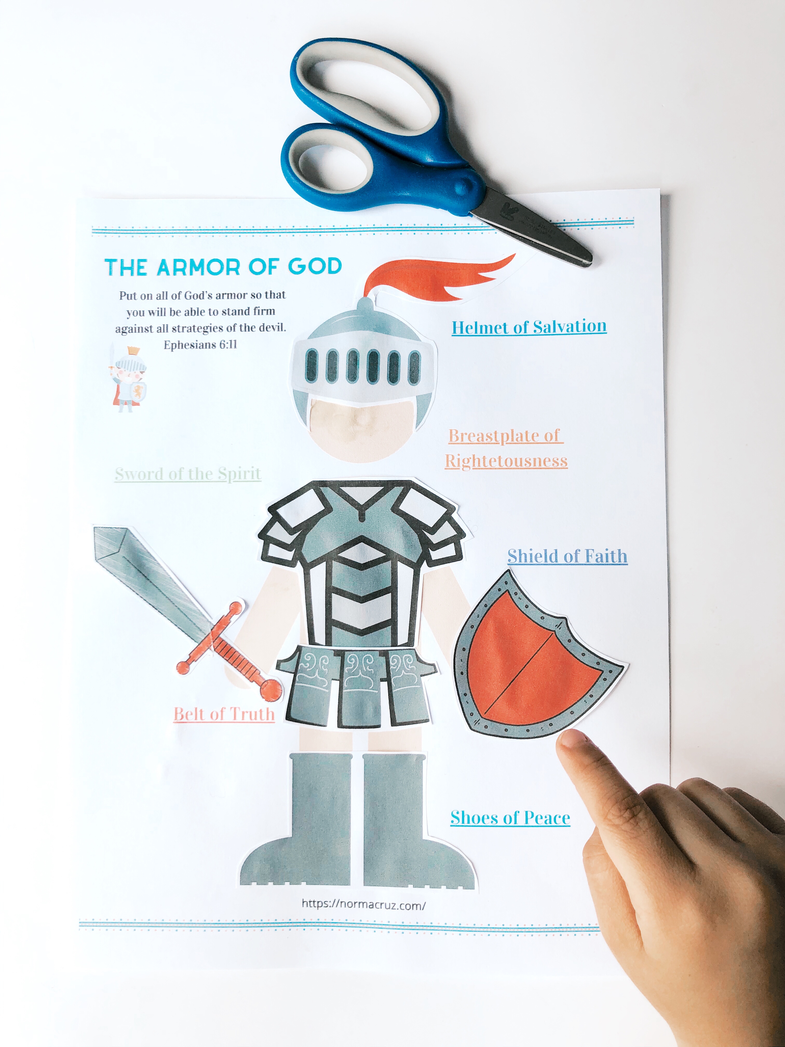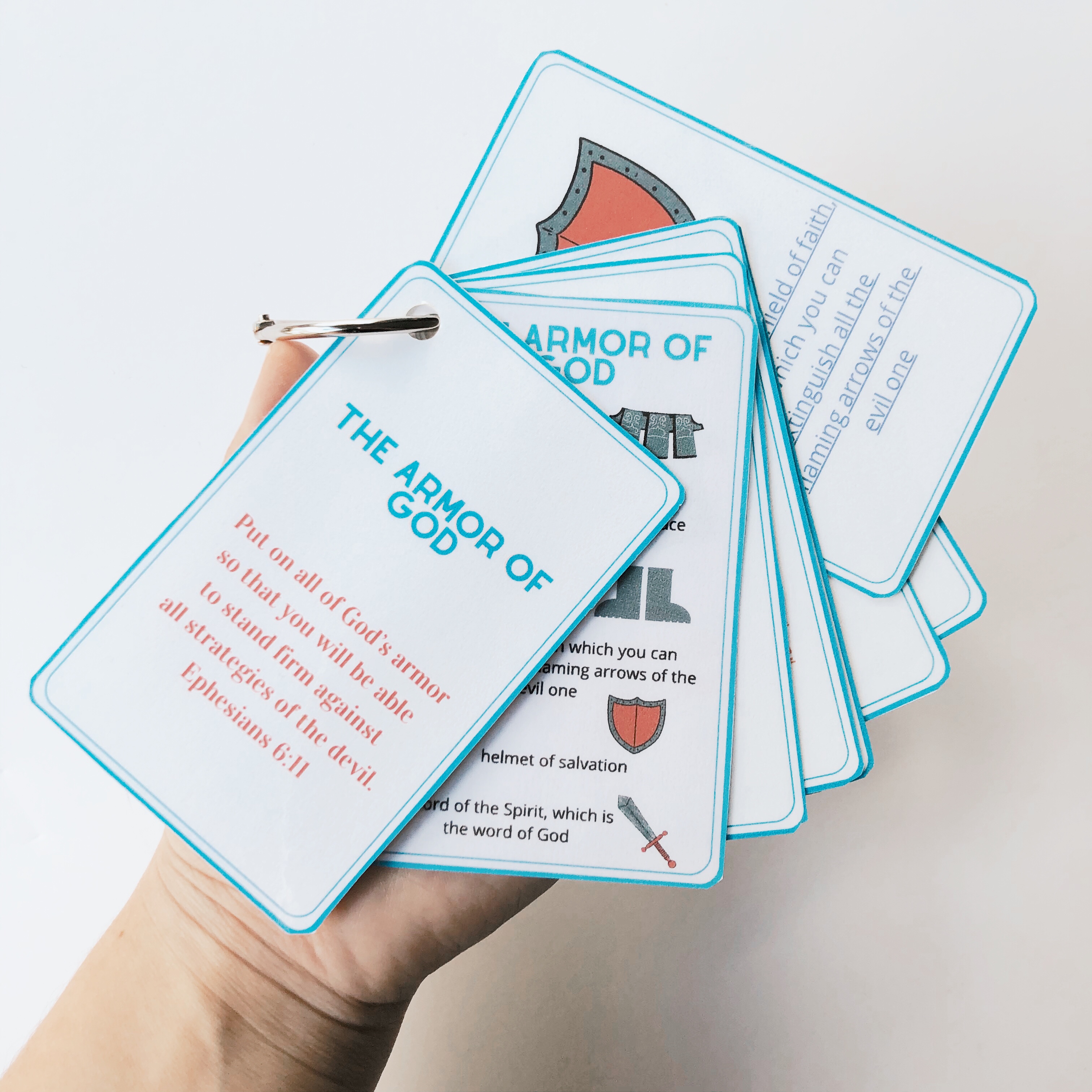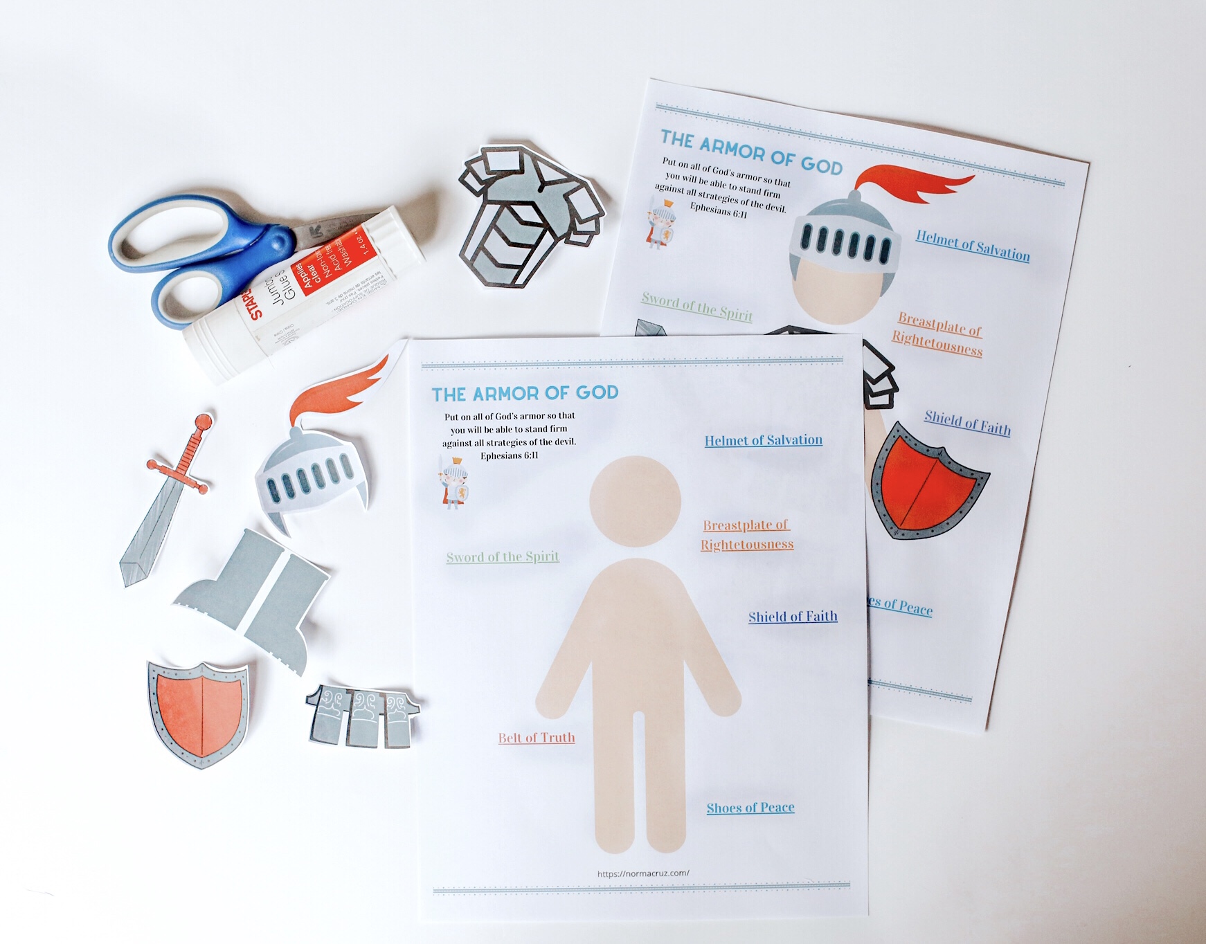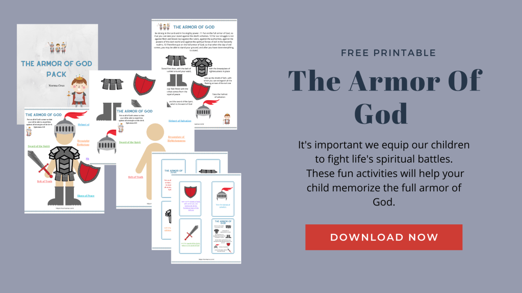 Below you will see the fun activity I created for kids to memorize the full armor of God and you can print it for free. It’s important we equip our children to fight life’s spiritual battles. The free printable pack includes a cut and paste worksheet for the kids to be hands on. I also added flash cards you can print, laminate, cut and use every day.